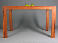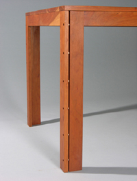 The table is made of cherry wood: 2" (for the center board of the table top) and 1" (legs, skirts and side boards of table top). The legs are joined with the skirts with mortice and tenons. The pairs of legs have 1/4" aluminum pipe spacers and are joined with screws. The table top is attached to the legs at 4 points (each corner). When a colleague saw the photos of the carved surface, he remembered 18th century tables from German villages with carved-out places for food, possibly because people were poor and didn't own dishes. The carving of the surface may have been result of eating food directly from the table.