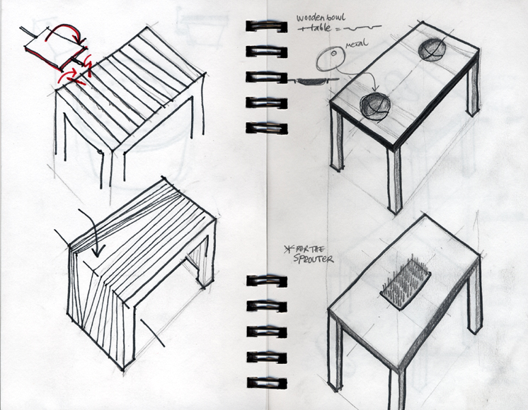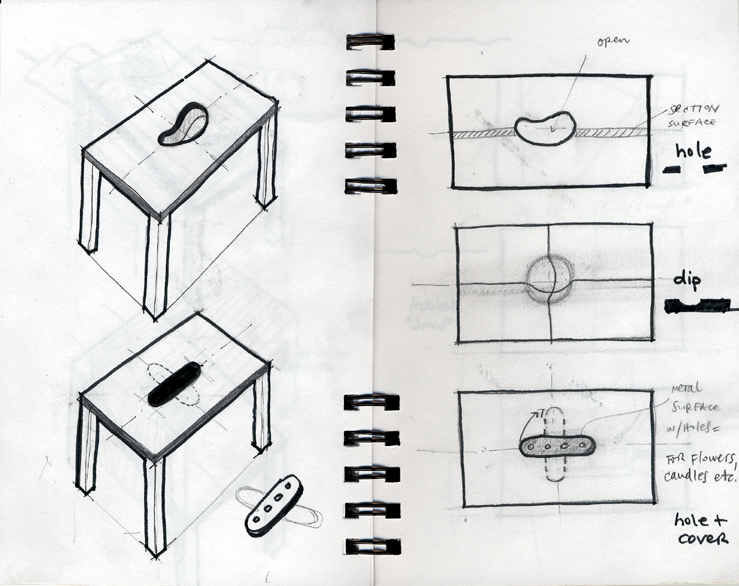 Furniture Design This project is also about objects we place on tables. The initial idea was to use silicon as a flexible top surface on which we can even serve food. More sketching went into direction of surfaces that were carved or cut out, or added (i.e. as containers for herbs, small gardens, etc.) The main idea was to merge a wooden bowl with the surface of the table.