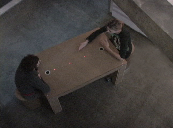 Two people, seated at each end of the table, converse. As they converse, light emitting diodes (LEDs), embedded along the center of the table, are activated by their pattern of conversation. Two microphones pick up the duration and the volume of the conversation at regular intervals, and trigger light animation from the end where one speaks toward the other. If both people speak simultaneously, the lights start animating from both ends.